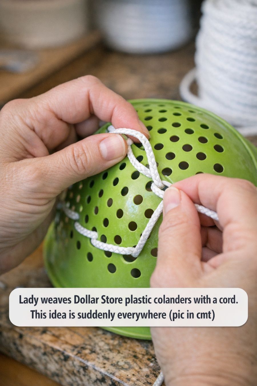 Lady weaves Dollar Store plastic colanders with a cord. This idea is suddenly everywhere